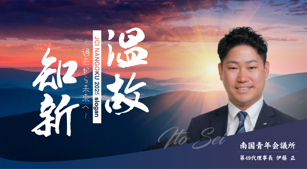 温故知新、過去(先達)から学ぶことで新しい知識や見解を得ることを意味しています。本年の南国青年会議所の期首人数は12名。そのうち3年未満の会員6名と半数が入会間もないメンバーです。私自身も含めまだまだ青年会議所としての活動や理念を理解しきれていない部分もあります。南国青年会議所が歩んできた道のりや、諸先輩方の活動から学び、私たちが何をすべきか考える1年にします。