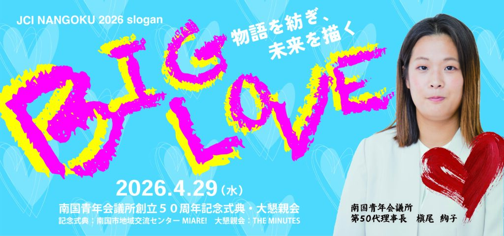 南国青年会議所は今年、創立から 50 年という節目の年を迎えます。半世紀もの⾧きにわたり、この南国青年会議所が活動を続けてこられたのも、生まれ育った地域への愛を胸に切磋琢磨してきたメンバー、愛情深く南国青年会議所の活動を支えてくださった関係団体各位、そして今日まで歴代理事⾧の地域への愛が込められた物語を絶やすことなく紡いできた、南国青年会議所シニア会の先輩方、皆様のご尽力の賜物です。人は決して一人で生きていくことは出来ません。愛は「他者を理解し、思いやる力」を生み、互いに協力し、信頼関係を築く原動力となります。南国青年会議所が繋いできた愛に心から感謝を申し上げると共に、次世代まで活動が続いていけるよう祈念し、2026 年度の事業を展開して参る所存です。